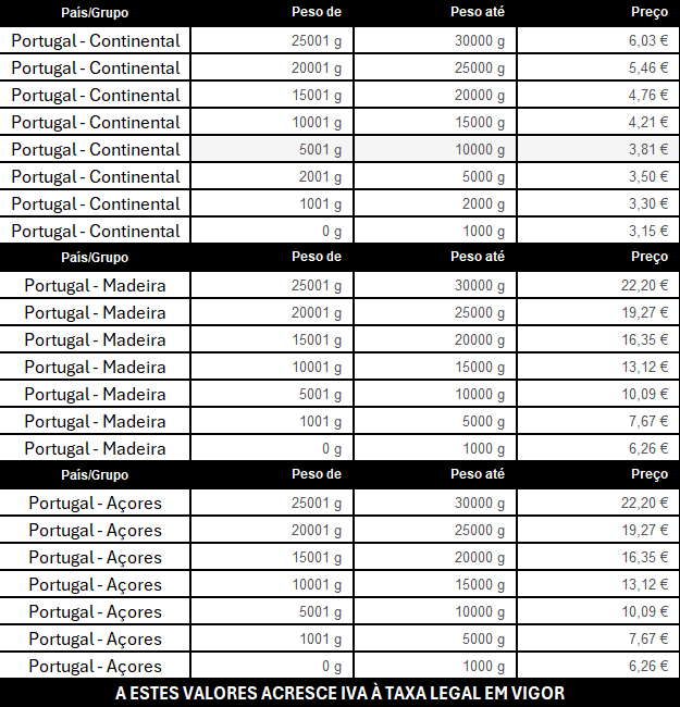 Os custos de envio são apresentados no acto de registo de uma encomenda em loja, no segundo passo do carrinho de compras, tendo em conta as seguintes características: